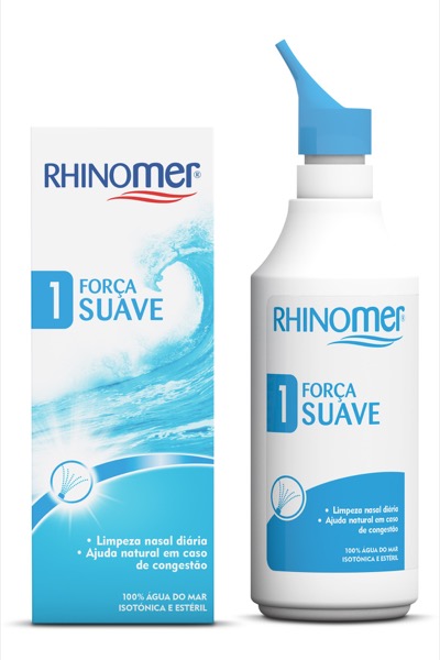 Rhinomer Força Suave. 100% água do mar isotónica e estéril. Limpeza e descongestão natural. Único com 4 forças. Para diferentes tipos de congestão.Rhinomer é 100% água do mar não diluída. Rhinomer apresenta 4 forças, que se distinguem pela força do jato e consequentemente pela intensidade da lavagem nasal. Rhinomer está indicado para limpeza nasal diária e ajuda natural em caso de congestão. Manter as fossas nasais limpas e em boas condições através de lavagens nasais regulares com água do mar ajuda ao seu bom funcionamento, e a prevenir irritações nasais. Rhinomer apresenta um teor em cloreto de sódio diminuído para ser compatível com a mucosa nasal mas conserva todos os minerais e oligoelementos da água do mar assegurando uma limpeza correta das vias nasais.